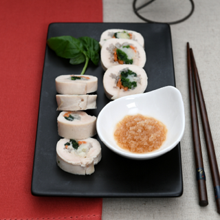 - 6. 마늘, 생강, 월계수잎 및 통후추를 넣고 끓인 물에 김이 올라오면 말아놓은 닭살을 찜통에서 20분 정도 찌고 한 김 식으면 썰어 접시에 담는다.
