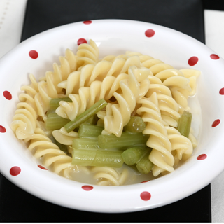 - 6. 5번에 생크림, 소금을 넣고 믹서에 간 뒤 푸실리와 머윗대를 넣고 한소끔 끓인다.