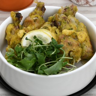 - 닭고기(날개, 8개), 어린잎(20g), 파슬리(5g), 머스터드(50g), 양파(50g), 마늘(20g), 레몬(1/4개), 튀김가루(100g), 소금(0.1g), 후추(0.01g), 식용유(400g)