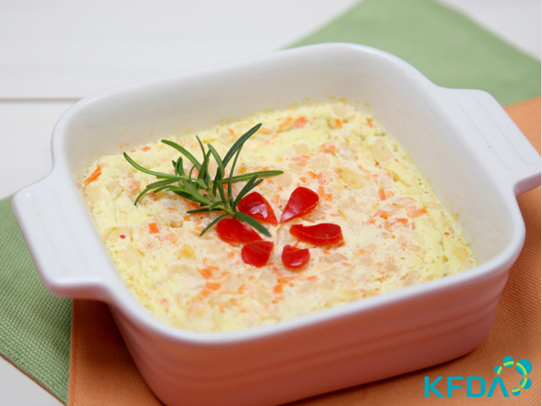- 달걀 50g, 밥 30g(쌀 13g), 김장김치 20g, 당근 5g, 양파 5g, 파 5g, 새우젓국물 2g, 물 100g