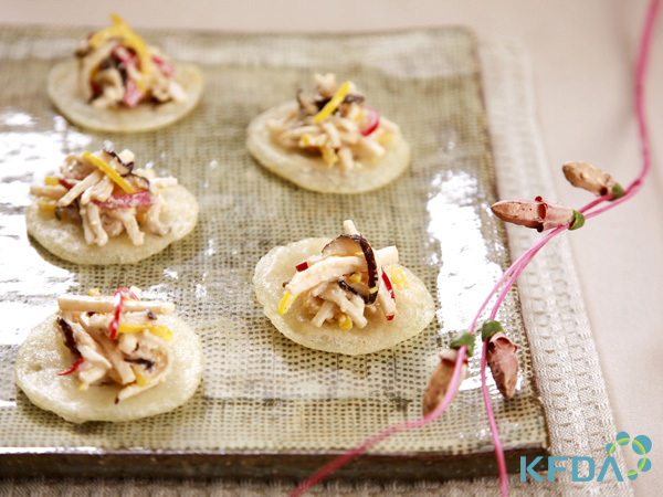 - 6. 채소볶음을 잣소스에 무쳐 찹쌀전병 위에 한 스푼씩 올려낸다.
