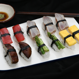 - 참치(100g), 파프리카(50g), 아스파라거스(3개), 표고버섯(2개), 달걀(2개), 밥(200g), 김(10g), 다시마(100g), 무(30g), 가쓰오부시(20g), 와사비(20g), 식초(20g), 설탕(20g), 소금(0.1g)
