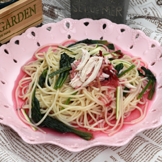 - 6. 팬에 삶아 놓은 파스타를 넣고 볶다가 닭살과 호박채, 시금치를 넣고 볶은 뒤 접시에 담고 차갑게 보관한 소스를 올린다.