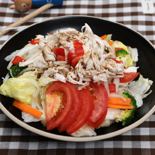 - 닭고기(80g), 월계수잎(1장), 통후추(2g), 정종(10g) 백김치(100g), 토마토(30g), 파프리카(20g), 당근(20g) 브로컬리(20g), 양상추(50g)