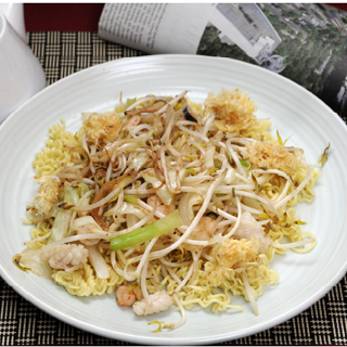 - 6. 팬에 올리브오일을 넣어 따근해지면, 오징어와 새우를 넣어 볶다가, 다시 숙주와 마요네즈, 설탕, ①번 소스와 채소를 넣어 센 불에서 재빠르게 볶고, 다시 면을 넣어 볶아 완성한다.