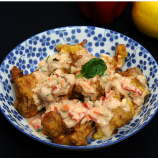 - 6. 튀김기름 온도가 170℃가 되면 버무려 놓은 닭(②)을 넣고 두 번 튀겨, 기름을 제거하고, ④번 소스에 살짝 버무려 접시에 담아, 준비한 요거트소스(⑤)를 올려 완성한다.