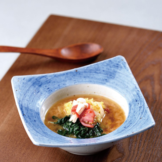 - 5. 그릇에 토마토, 시금치, 알배추를 담아주고 끓여준 된장국을 붓는다. 고명으로 팽이버섯을 올려 완성한다.