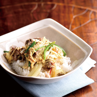 - 쌀밥 200g, 소불고기 150g, 양파 60g, 청고추 15g, 홍고추 18g 팽이버섯 20g, 계란 60g, 쪽파 15g, 마늘기름 30g, 통깨 5g