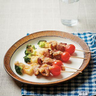 - 5. 꼬치에 방울토마토, 구운 돼지고기, 파인애플, 브로콜리 순서로 끼운 후 굽는다.