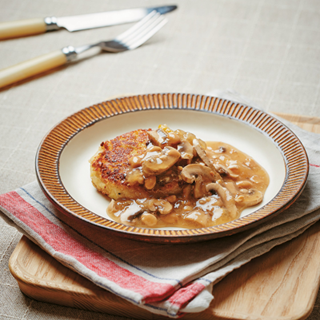 - 6. 다시마육수에 청국장, 유자청, 녹말가루, 양송이버섯을 넣고 조린 청국장소스를 곁들여 마무리한다.